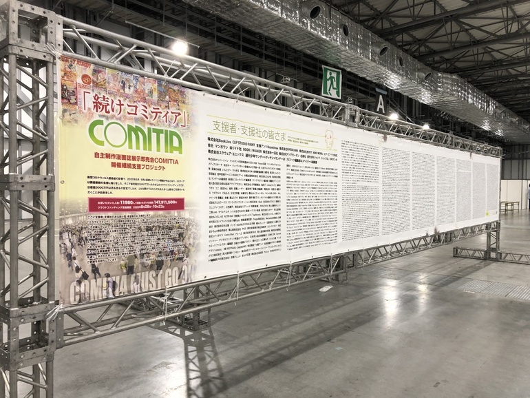 さて当日の会場内では、昨年行ったコミティア開催継続支援クラウドファンディング関連の展示を行いました。カタログと会場に、支援者のお名前(希望者のみ)の大きな掲示を行い(写真参照)、御礼を伝えました。また、支援のリターンとして、カタログには代表対談や支援社の紹介記事を掲載。会場にはたくさんの支援社の広告スペースが並び、場内を華やかに彩りました。そこにコミティアへの応援メッセージを書いてくれた企業も多く、嬉しく拝見しました。この時のたくさんの支援のおかげで、この状況下でもイベント開催を継続できています。そのことへの感謝と責任を胸に刻みながら、これからにつなげてゆく所存です。あらためて心より御礼を申し上げます。