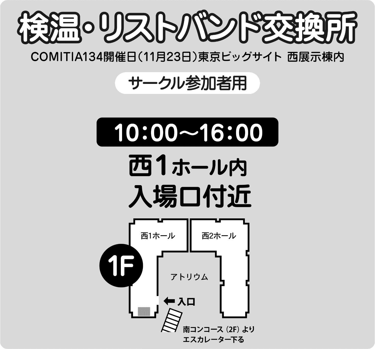 リストバンドによる入場者確認を行います。そのため今回のコミティアではカタログの提示のみでは入場が出来ません。来場したら下記の手順に沿って、検温・リストバンド交換所にて、カタログに付属する「連絡先カード」を入場用のリストバンドと交換し、そのリストバンドを着用した上で入場してください(再入場も同様です)。