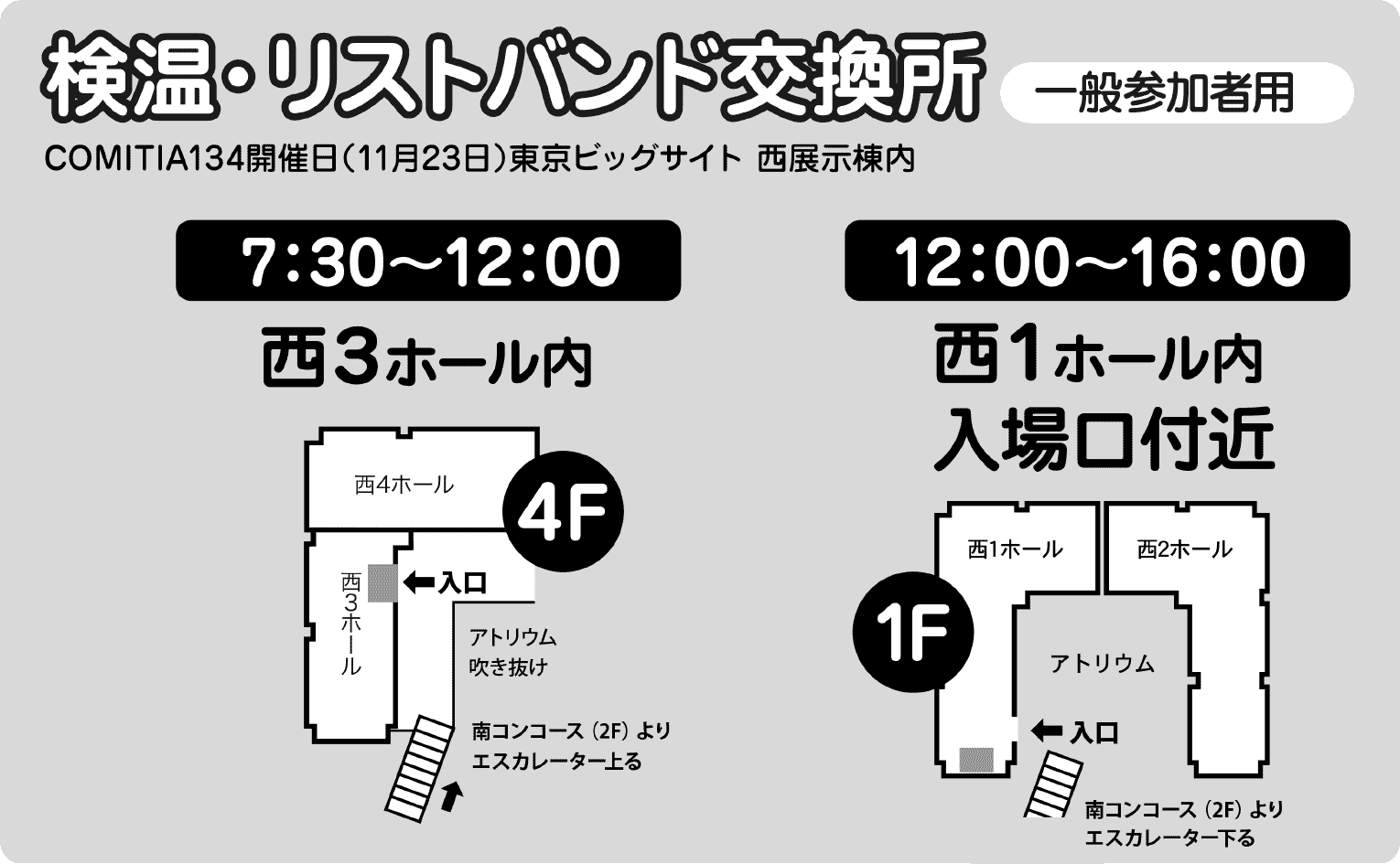 リストバンドによる入場者確認を行います。来場したら下記の手順に沿って、検温・リストバンド交換所にて、「サークル通行証」を入場用のリストバンドと交換し、そのリストバンドを着用した上で入場してください(再入場も同様です)。