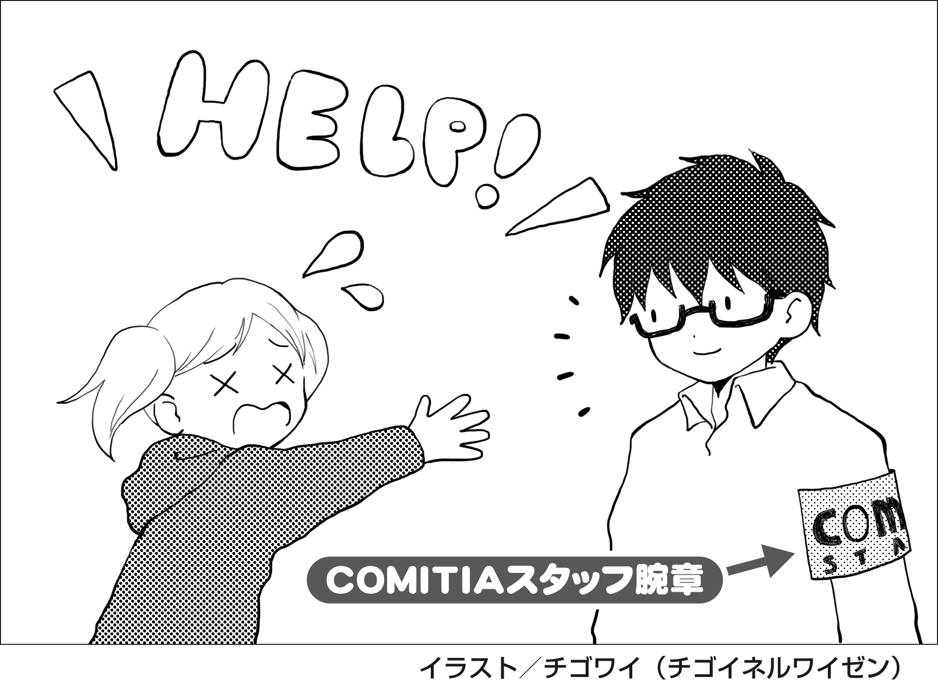 困ったときは、開場中に本部か近くのスタッフにお知らせください。スタッフは「COMITIA」の腕章をしています。