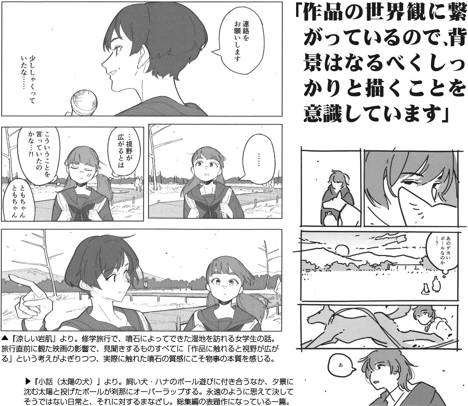 その後も思春期の子供たちの少し背徳的な人間模様を描いた『白粉花の告白』や、現実と幻の区別が曖昧になる館に迷い込んだ女性の一日を描く『ランダルギィ・ポー幻想館』といった作品を次々発表。「常連の読者さんが増えていって、交流することが新刊を出す原動力になります」。さらに商業でも複数の雑誌で読切を掲載。「今は、自分の中に眠る物語を一つでも多く形にしたい」と、コロナ禍のブランクを埋めるように活動している。