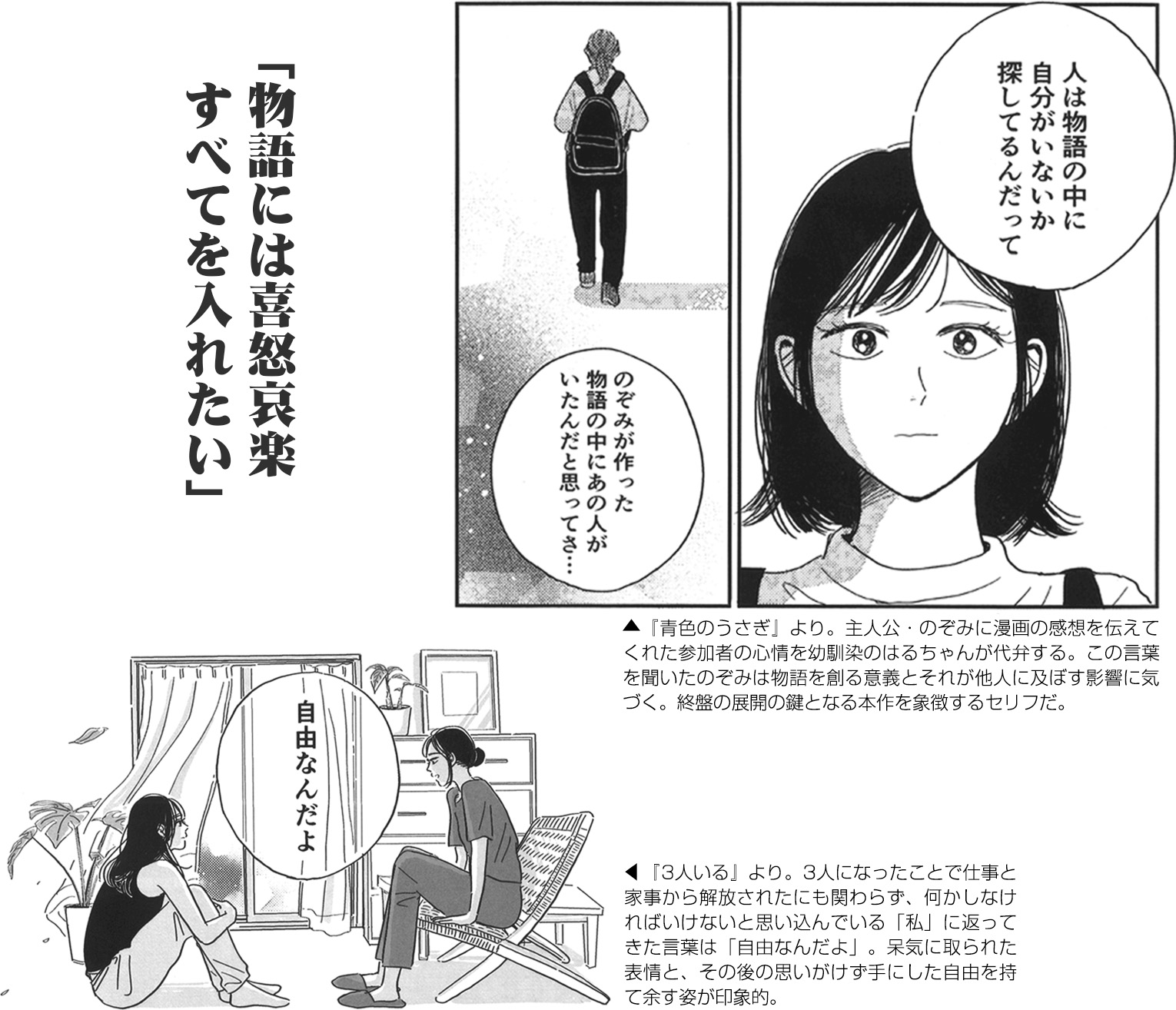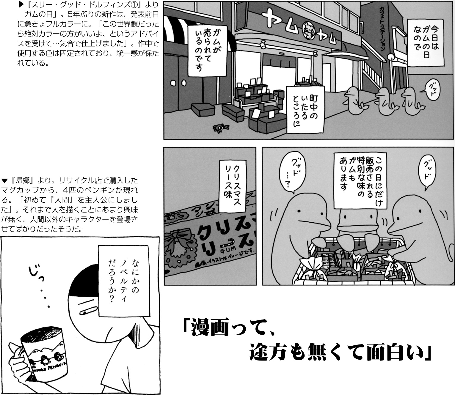 今年10月にはWEBマンガサイト「COMIC熱帯」(光文社)で読切『岩毬山大観光ホテル』を発表し大きな話題を呼んだ。「日常の中で見つけた不条理の面白さ・感動・驚きを、他の人にも体験して貰うにはストーリーがある漫画という表現が一番合っている」と語る。「『これを一緒に面白がろうよ』っていう、誘いみたいな気持ちで死ぬまで描き続けていきたいですね」