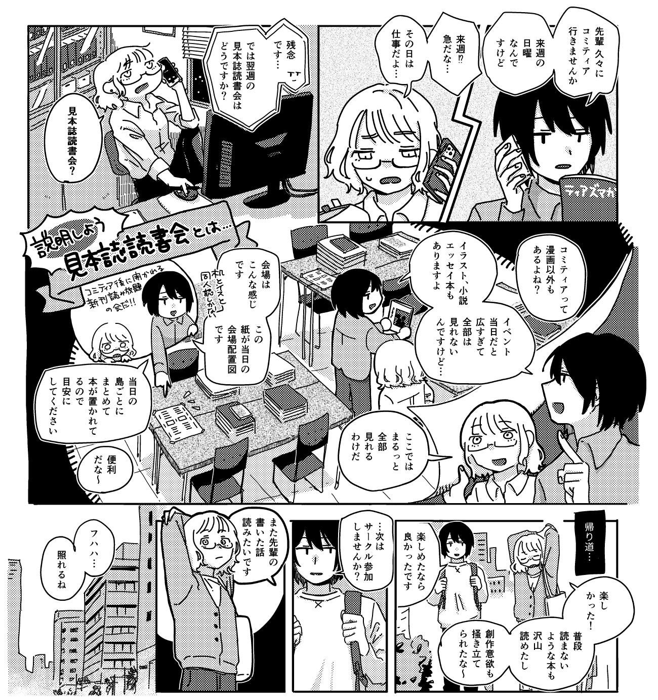 見本誌読書会は、コミティアの参加サークルから提出された見本誌を自由に閲覧できるイベントです。基本的にコミティア開催から約一週間後を目安に、都内の公共施設や会議室などで開催。直近のコミティアで参加サークルから提出していただいた見本誌を展示しています。詳しい説明は読書会のご紹介 をご覧ください。