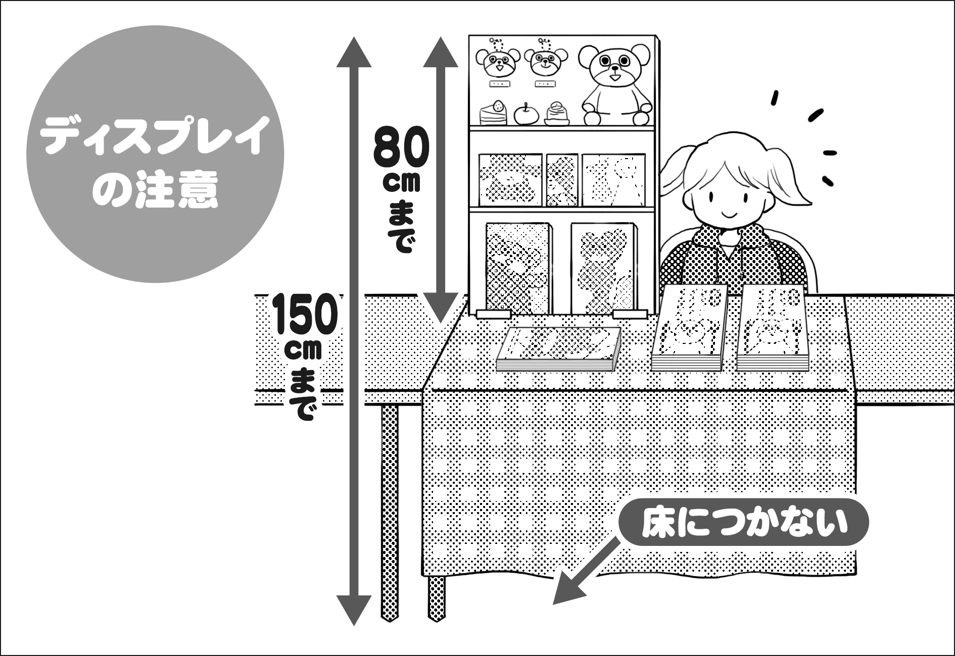 販売物を並べるラックの高さは、卓上から80cm(床から150cm)までとし、通路側から出展者の顔が見えるようにしてください。