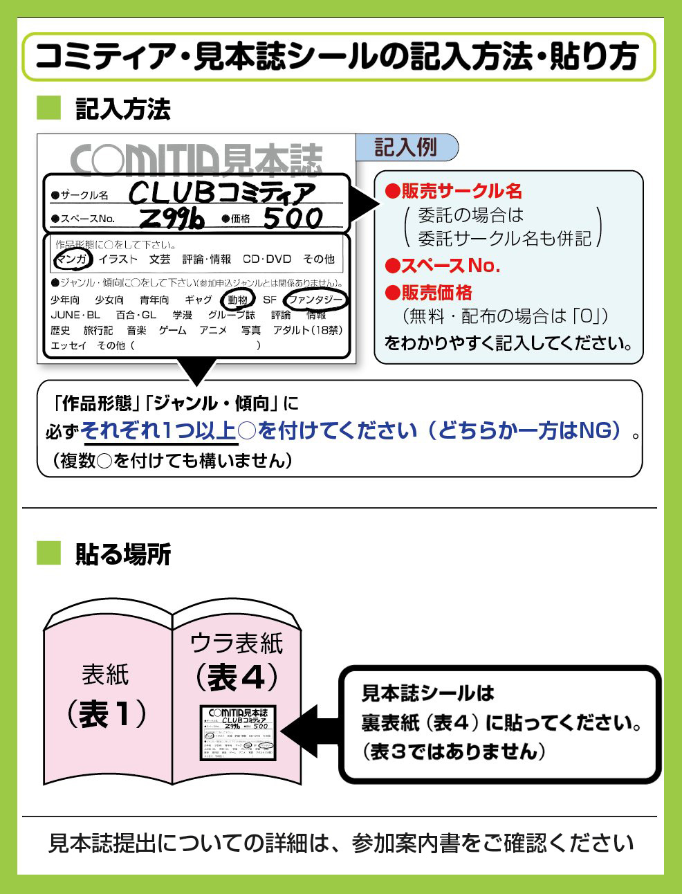 ※「東京開催のコミティアで初めて販売する作品」は、原則として見本誌を1部提出する必要があります。詳しくはこちら。参加案内書一式に「見本誌シール」が入っていますので、以下のように準備して貼り付けておいてください。