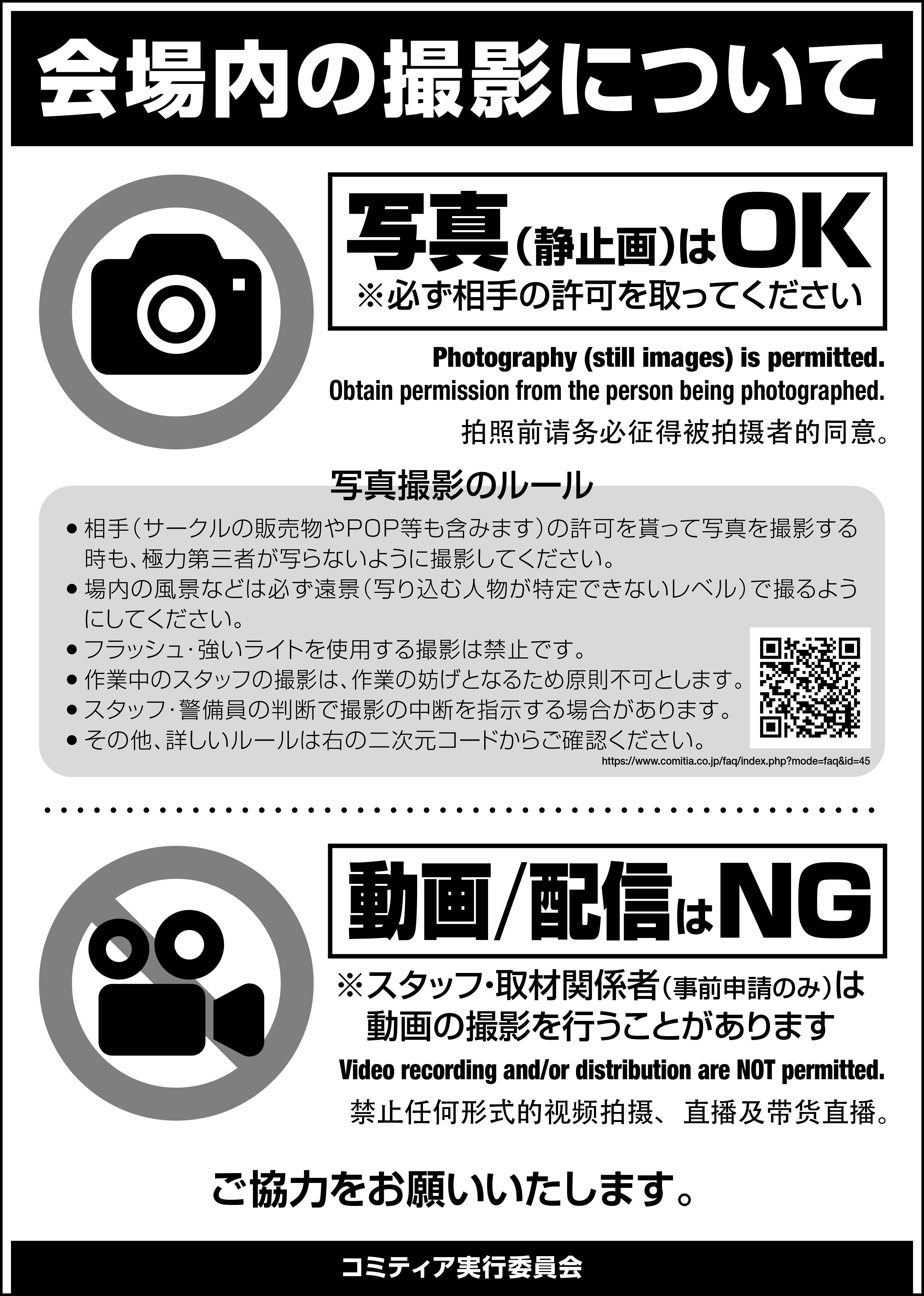 ですが、他の人・他のサークルが映り込んでしまうと思わぬトラブルに繋がります。撮影の規定を確認したうえで、周囲への配慮をお願いします。