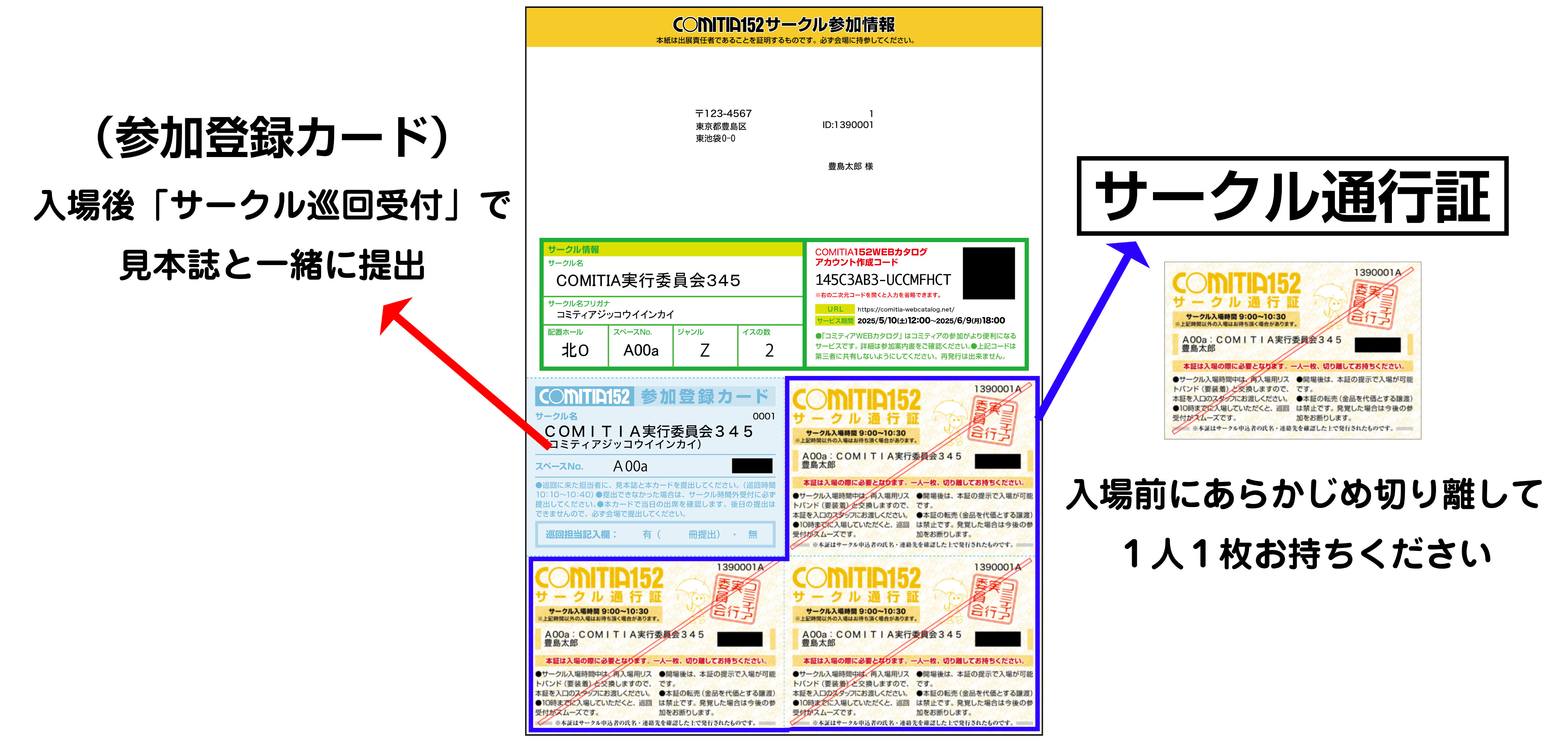 入場の前に、あらかじめ「サークル参加情報」(参加案内書の封筒に同封)から「サークル通行証」を切り離して、1人1枚手に持つようにしてください。
