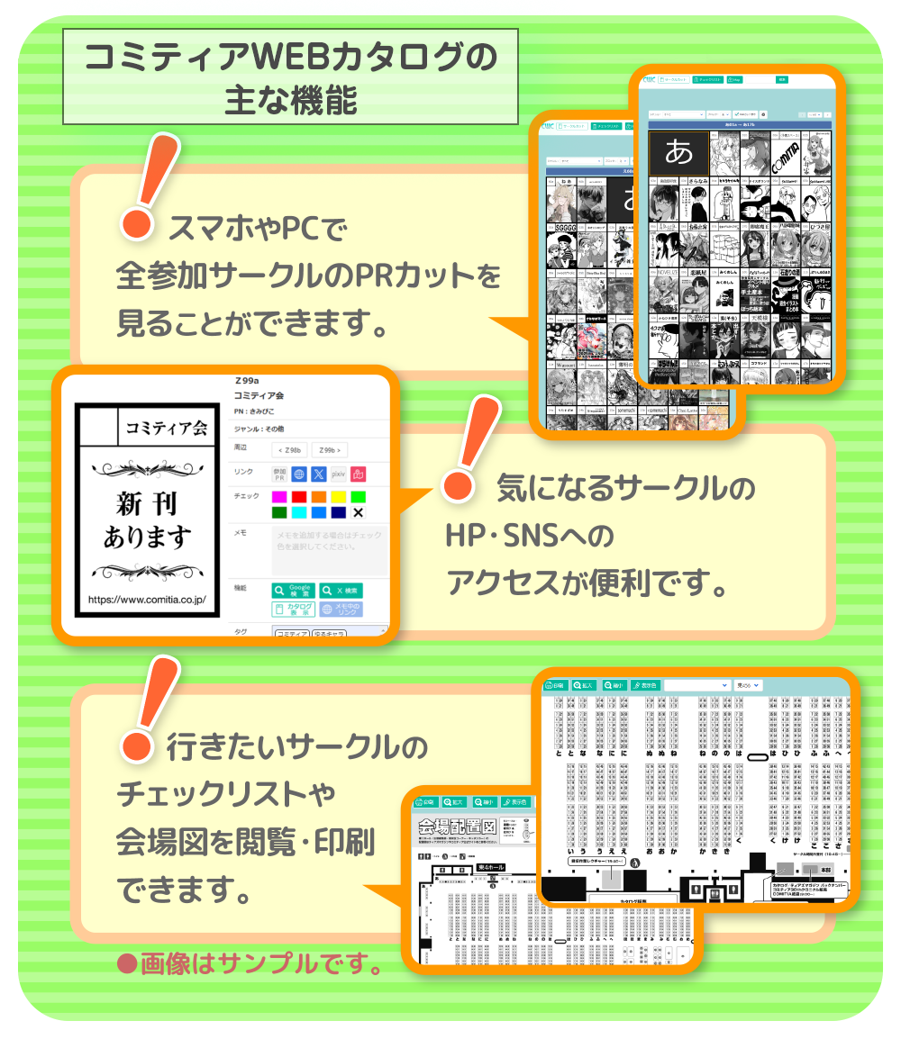 参加サークル情報の閲覧・検索、チェックリスト作成や印刷、会場図の表示・印刷などを行うことができるサービスです。サークル参加者は、1スペースにつき1つ付属するサークル専用の「アカウント作成コード」で、「WEBカタログ」を無料で利用することができます。
