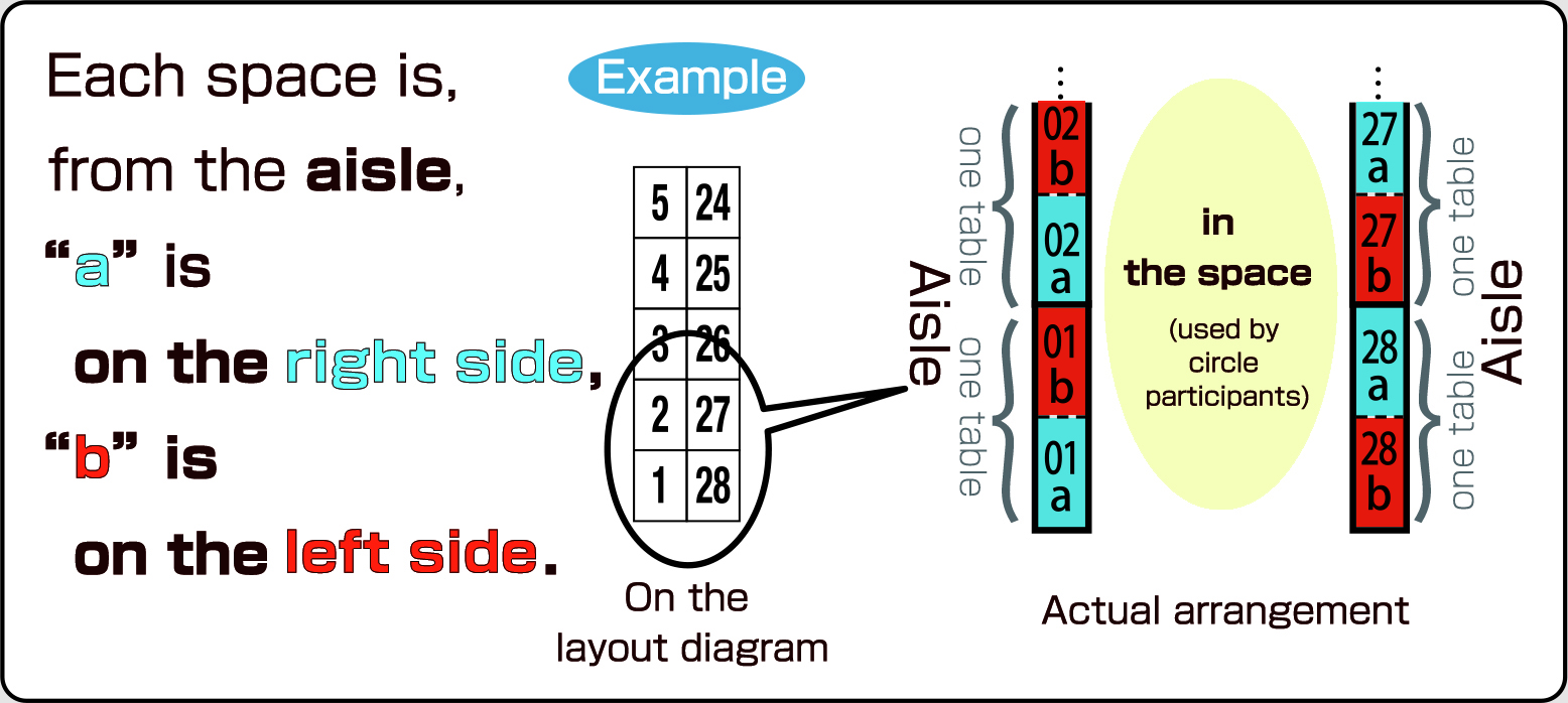 For example, “あ01a” means that the circle is located on the right side [a] of the long desk at [01] in the [あ] block.
