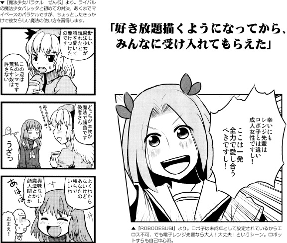 彼がコミティアに初めて出展したのは、さかのぼること十数年前。友人の誘いで合同誌に寄稿したことがきっかけでした。その後、個人サークルでしばらく参加していましたが、ある時に出した同人誌がヒトケタしか売れなかったことにショックを受けて一念発起。このまま年に4本コミティアに向けて描くだけでは何も変わらないと、練習がてらウェブで始めたのが「琴浦さん」。それと同じ時期にコミティアで発表していたのが「魔法少女パラケル」シリーズです。