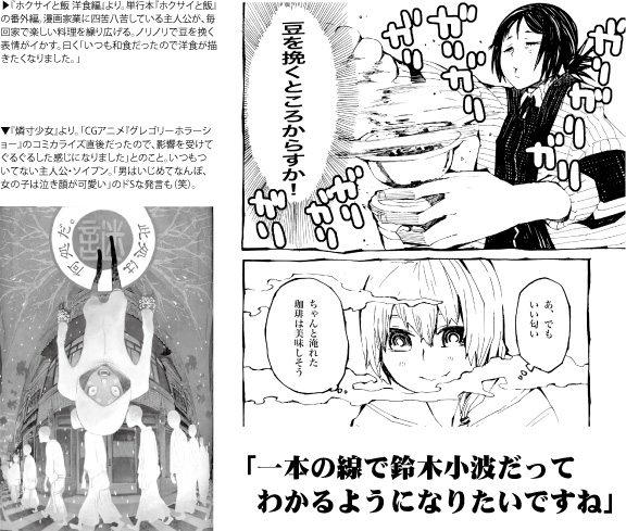 昨年は、愉快な発想に捻りが効いた話が集められた『出落ちガール』を皮切りに、「食」がテーマの『ホクサイと飯』、アクション満載の『ヤオツクモ』と、3ヵ月連続単行本リリース。学年誌『小学六年生』の連載をはじめとし、『ブラック★ロックシューター』を代表とするコミカライズ、王道少年マンガなど、プロとして手がけてきた作品は枚挙に暇がない。一方で、モノクロスケッチの画集や商業誌掲載の再録、短編作品など、長年に渡り同人活動も続けてきた。