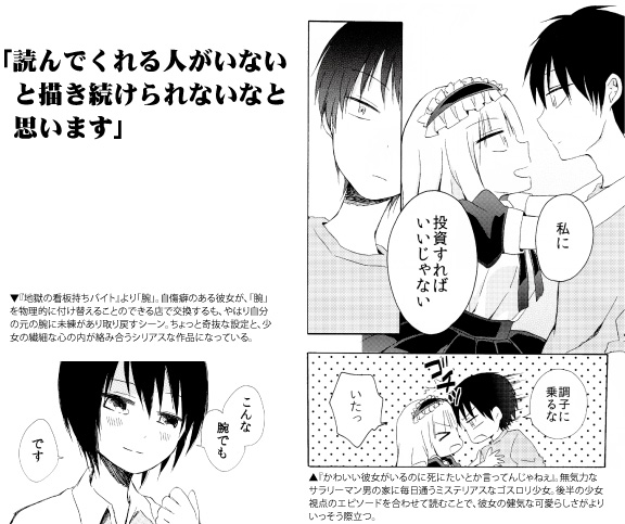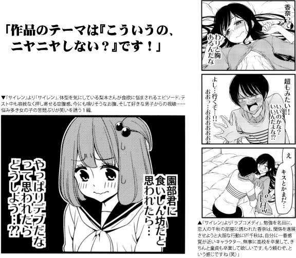 コミティアへ「パコキリン」が初めて参加したのは、既に漫画家として軌道に乗っていた2010年。「最初は単行本の営業のつもりでした」と言う裏にはあったのは危機感だ。単行本を出しても本屋には短期間並ぶだけ、雑誌に描いたものの単行本が出ないままの作品も少なくない…そんな現状に対するアプローチでもあった。「少しでも読んでもらいたい。出していれば読者の反応もあるので」鈴木さんの凄さは単なる商業の延長に留まらないところだ。「同人誌で短編を発行しながら、次何描こうかと考えてると、それが仕事のネタにもなったりして。趣味としても仕事としても、取り敢えず描くのは楽しいです(笑)」と全くもって根っからの創作好きである。多種多様に出される同人誌には毎回驚かされるばかりだ。