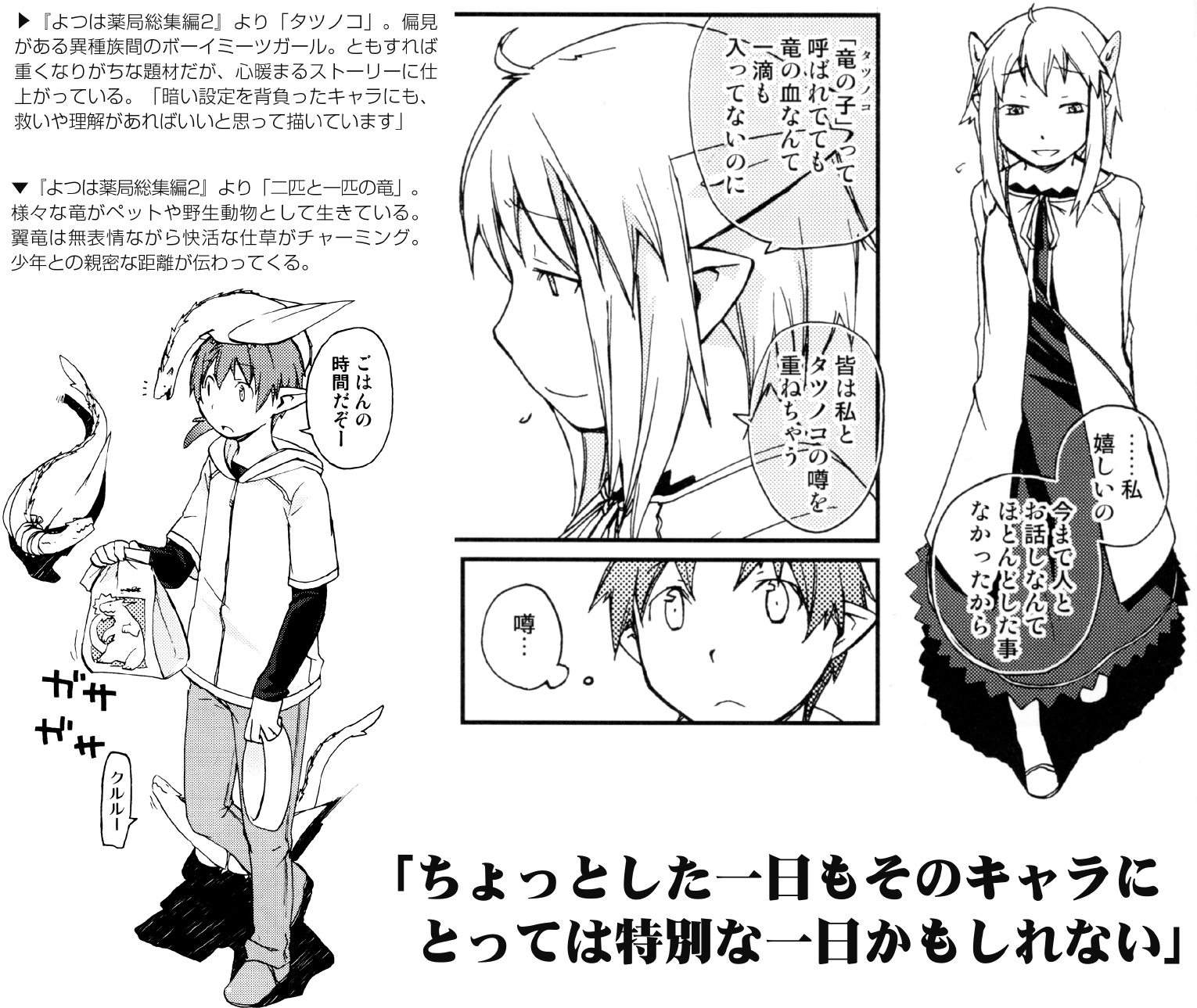 就職後、舞台用だったシナリオを元に、試行錯誤を繰り返しながら初めて完成させた読切「帰る」で、10年に『月刊アフタヌーン』の四季賞準入選を受賞。本格的にプロを目指すために退職し、アシスタントをしながら漫画修業を続けたが、読切が一本掲載されて以降、努力が実を結ばず活動を一時断念。そんな時に、作品発表の場を求めてコミティアへの参加を決めた。「『このままでは漫画を描かなくなってしまう』という危機感がありましたし、家で眠っていた商業誌の没ネームをきちんと形にして、人に読んでもらうことで供養したかったんです」。同人誌では、地下鉄構内に店を構える沖縄物産展で働く女性と、その周囲を行き交う人々の群像劇『地下鉄に花と花唄』や、ベテランOLのベールに包まれた半生を後輩の新人の視線で描く『児玉さん』など、“普通の大人たち”が、日常の中で人生について深く想いを巡らせるドラマを発表し続けている。
