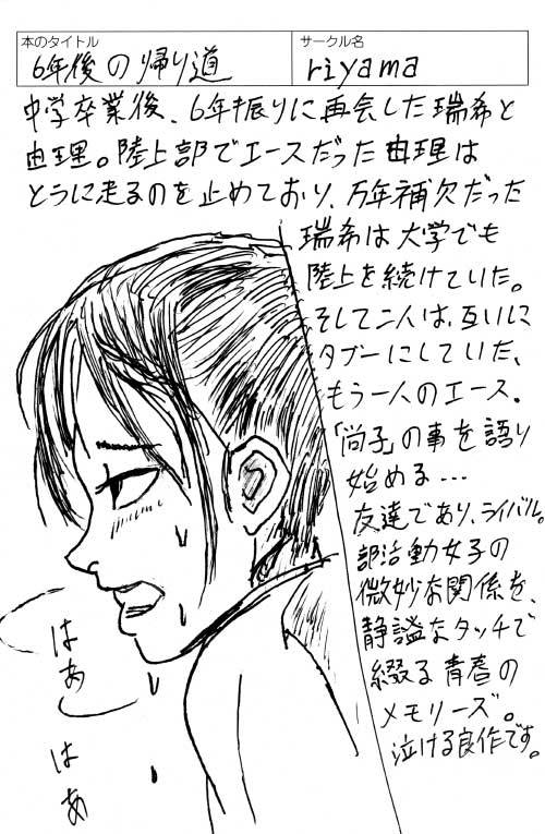 ●中学卒業後、6年振りに再会した瑞希と由理。陸上部でエースだった由理はとうに走るのを止めており、万年補欠だった瑞希は大学でも陸上を続けていた。そして二人は互いにタブーにしていた、もう一人のエース「尚子」の事を語り始める…。友達であり、ライバル。部活動女子の微妙な関係を静謐なタッチで綴る青春のメモリーズ。泣ける良作です。(神奈川県・あきらふ)