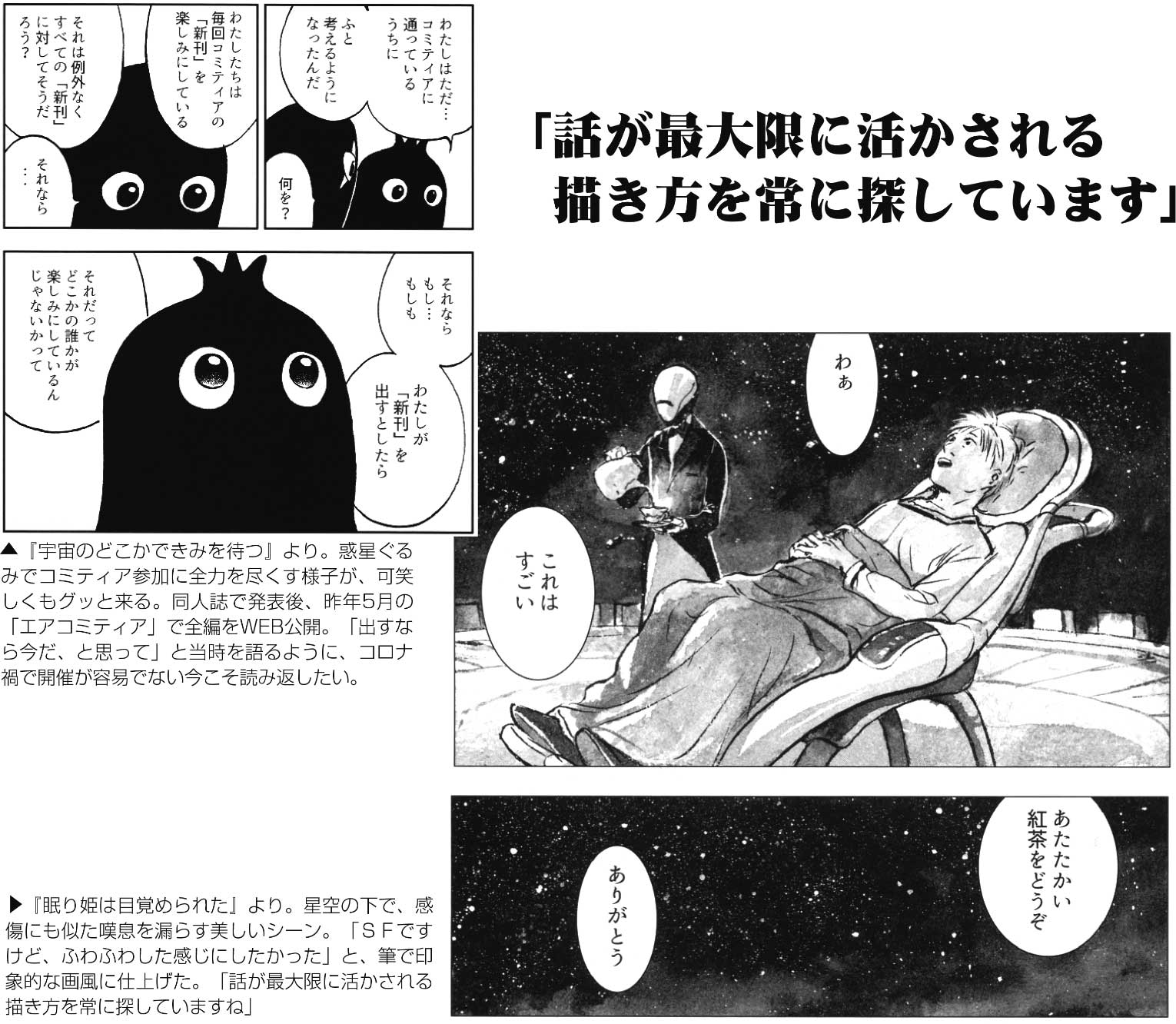 イラストレーター、また子を持つ親として慌ただしい日々を過ごす森倉さん。多忙な合間を縫っての同人活動は毎回、試行錯誤の連続だと話すが、イベントに参加することは楽しみの一つになっている。「同人は、自分の好きなものを表現できる世界。それを人と共有することで交流が生まれたり、創作意欲をもらえたりするので、今後もできる限り本を出し続けられたらいいなと思っています」
