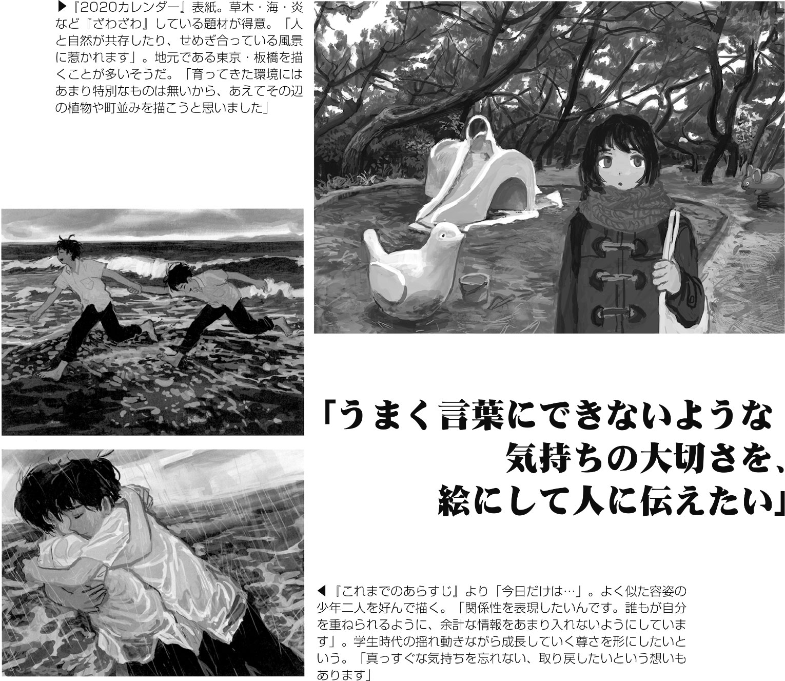異世界ファンタジーを思わせる作風の源流は、小学生の時好きだった「チョコボの不思議なダンジョン」まで遡る。「キャラクターデザイナーの板鼻利幸さんが描くデフォルメされた造形が可愛すぎて、模写ばかりしてました」。中学では引き続きスクウェアのゲームに傾倒しつつ、イラストレーターの帝国少年さんの作品に大きな影響を受ける。「昭和レトロ風に細かく描かれた風景に、『絵で世界そのものを創ることができるんだ』ってハッと気付いたんです」。その後は細緻な絵やキャラクターを描くことに夢中になった。
