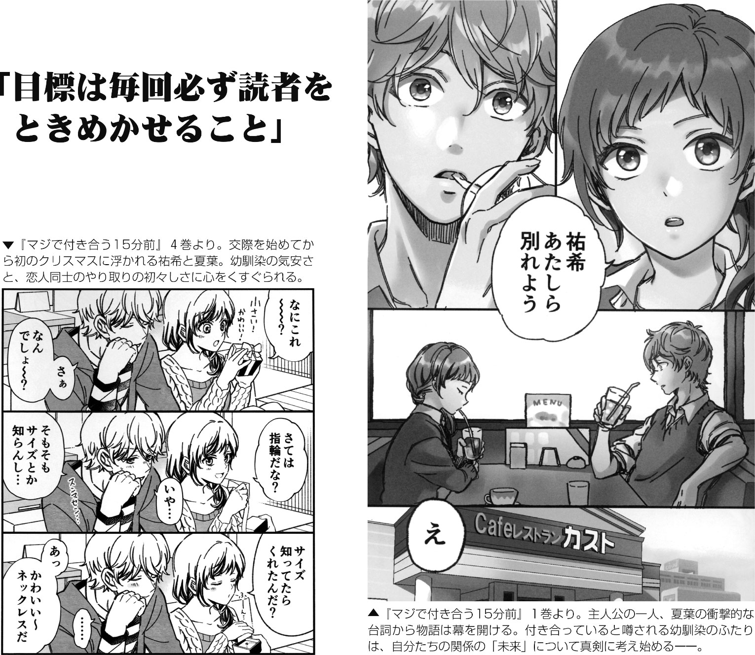 『マジで付き合う15分前』が読者から支持されるのは、至近距離恋愛という題材の新鮮さや、王道の恋愛漫画ならではのエモさにありそうだ。「目標は毎回必ず読者をときめかせること(本人はキャバクラ感と呼んでいる)。読者を絶対に喜ばせて、リピーターになって欲しいんです」。大学受験、そして卒業と高校生活のクライマックスが間近に迫り、主人公たちの恋愛がどんな結末を迎えるのか。今後の展開からも目が離せない。
