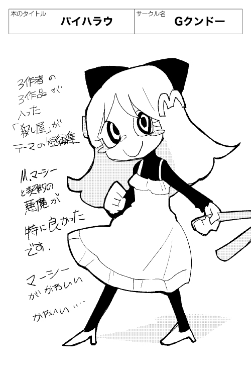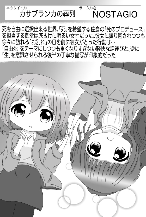 ◆2名の作家による犬をテーマにした合同誌。一方は大吉ならぬ犬吉を引いたサラリーマンに起きた顛末を描き、もう一方は飼い主と宇宙に打ち上げられる犬との絆をSFチックに描く。どちらも短編ながら綺麗にまとまっており、ヒトと動物の出会いや絆に心暖かくなる。(東京都・ミミサワー)