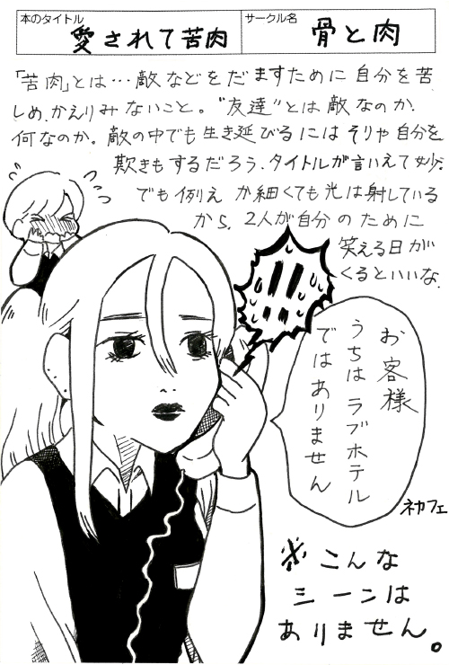 ●まず同人誌自体が紐で綴じられており、"秘めごと"を想起させる仕掛けが秀逸。気にかけてくれた先輩・美都に憧れて同じダンス部に入部した奥手な主人公。先輩が卒業を迎える日、想いを伝えるべきか悩むのだが…。髪をリボンで結う伝統のある学園で、双方の心がほどけていくラストが切なくも心地よい。(埼玉県・tukemen)
