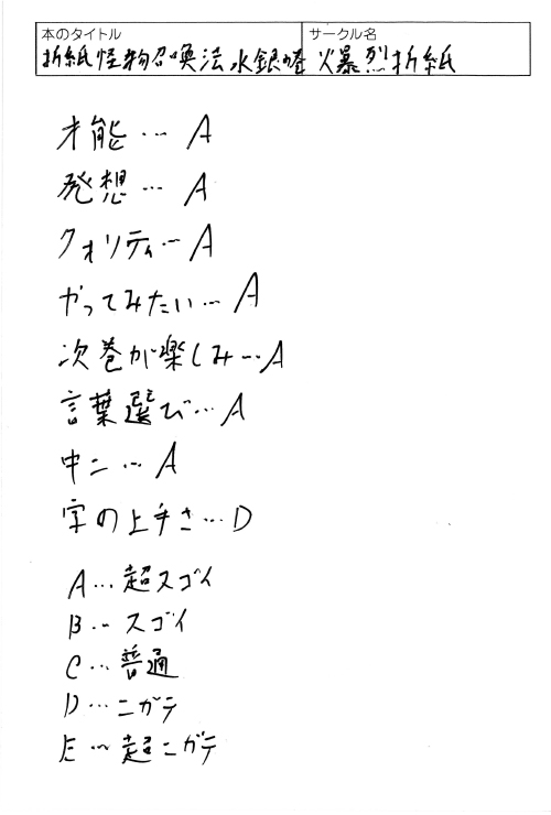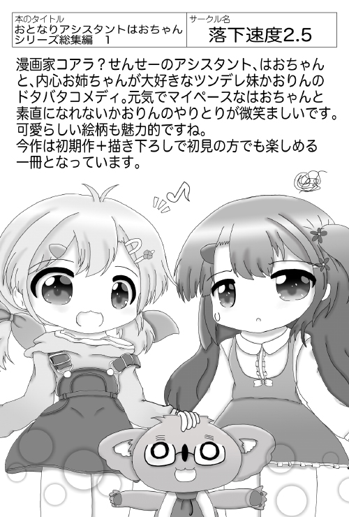 ●賑やかな二人の可愛いさが伝わってきました! 明るい魔法薬師のミオちゃんと助手のメトルファンちゃん。ミオちゃんの持ってるハチャメチャさは、今後のお話でも楽しみですね。オリジナルのファンタジーなので、始まったばかりですが、今後も楽しみに見守りたいです。コミティアらしい創作の芽が見える作品でした。(静岡県・コシモ)