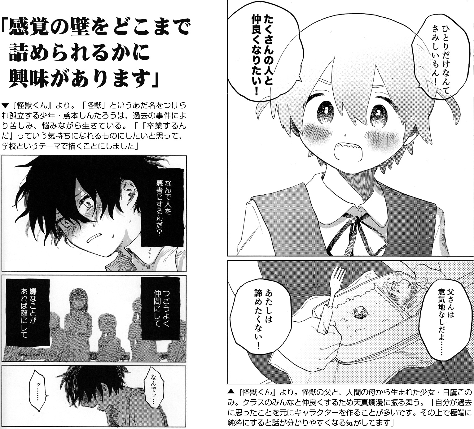 代表作『怪獣くん』は、22年1月に卒業制作として発表したもの。中学校を舞台に、怪獣と人間のハーフの少女・このみと、過去の暴力事件をきっかけにクラスで孤立する少年・しんたろうの交流を描く。「初めて自分自身に向けた作品を作った」と言い、いじめについても考えさせられる意欲作だ。大きな話題を呼んだ同作は、9月には双葉社から商業版が発売された。