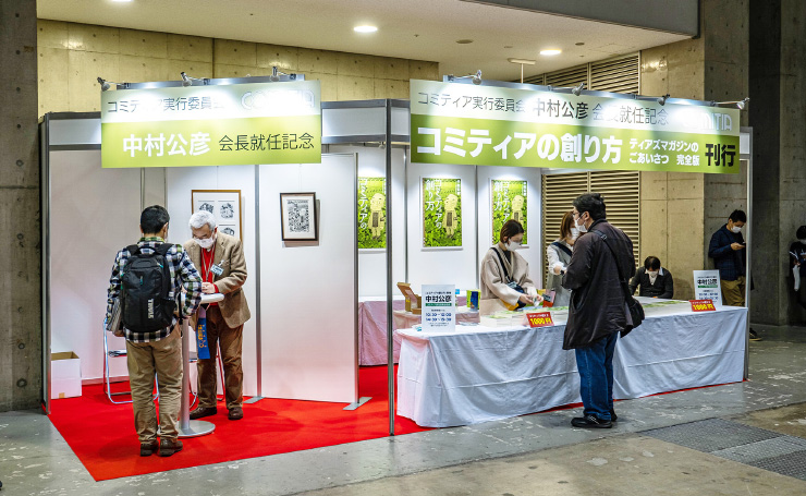 今回は本レポートを書いている私、吉田が代表として初めて迎えるコミティアでもありました。何度もお伝えしている通り、前代表の中村は「会長」となり今後もコミティアに関わっていきます。当日は会場内企画として、中村の会長就任を記念して発行した『コミティアの創り方 ティアズマガジンのごあいさつ完全版』の記念販売ブースを設置。中村自身もブースに立ち、サインに応じたり、労いの言葉をかけられたりと忙しくも充実した一日になったようです。あわせてお世話になっている同人誌印刷所、同人誌即売会、関連企業、関係者の皆様から沢山の祝花をいただきました。この場を借りて感謝を申し上げます。