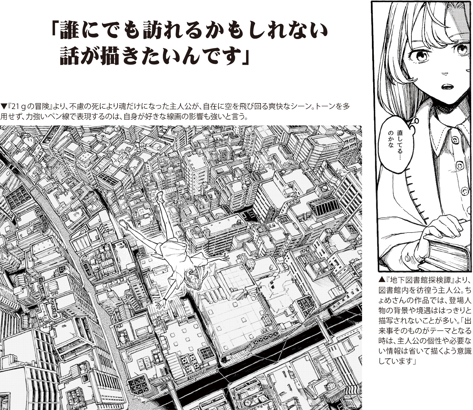 ありきたりな図書館の地下に潜むもう一つの「図書館」に迷い込んだ主人公。そこには、一人一人の生き様を記録した本が収められていた——。『地下図書館探検譚』は、空間と常識を超越した異世界の、どこまでも続く緻密な作画にまず圧倒される作品だ。その一方で、自己の過去を省みる主人公に、読者が自身を重ねてしまう不思議な読後感も併せ持つ。「誰にでも訪れるかもしれない話が描きたいんです」との言葉通り、身近ながら「ありそうでなさそう」な世界観のバランスこそ、ちょめさんの作品の真骨頂だ。