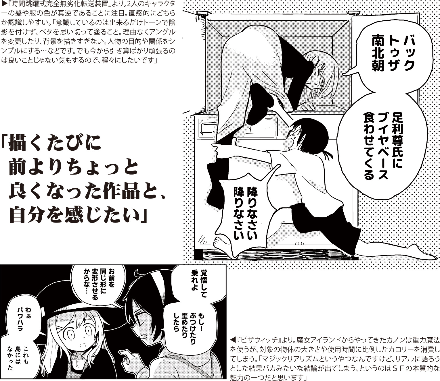 学生時代はネット上でイラストを中心に発表していたちょめさんが、コミティアに初参加したのは14年。友人からの誘いだったが、その印象は強烈だった。「オリジナルで描いてる人の多さ、規模に圧倒されて。こんな世界もあるんだ、と思いました。今も参加する度にすごく創作の熱気にあてられて、そのまま次の回の申込も済ませてしまうほどです」。19年にはサークル名を「室外機室」と改め、『喫茶フロンテーラ』を発表。好きだった少年漫画のコマ割りやジブリ作品の背景を参考に、描き込みにはこだわった。「上京した時、地元の街並みとここまで表情が違うのか、と衝撃を受けたことがあります。私の作品の背景も、作品の空気そのものが伝わる描写を目指しています」。同作はP&Rに紹介され、以後の方向性を決める重要な作品となった。