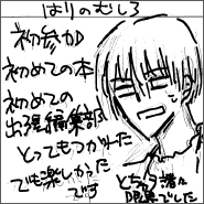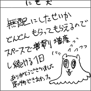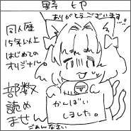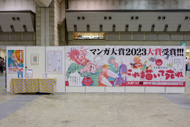 会場内では過去に告知イラストを描いていただいたコミティアとも縁の深いマンガ家・とよ田みのるさんが「これ描いて死ね」で『マンガ大賞2023』を受賞したことを記念する展示を行いました。これは同作にコミティアが実名で重要な場所として登場することから企画したもの。掲載誌である小学館『ゲッサン』編集部の協力のもと、記念パネルを始めとしたお祝いコーナーを設置。会場中央の目立つ場所にあり、足を止めて展示を眺める参加者も多かったです。用意された無料配布の試し読み冊子は全て参加者の手に渡っていきました。また、カタログ「ティアズマガジンVol.144」誌上ではロングインタビュー(WEB公開中)を掲載しています。
