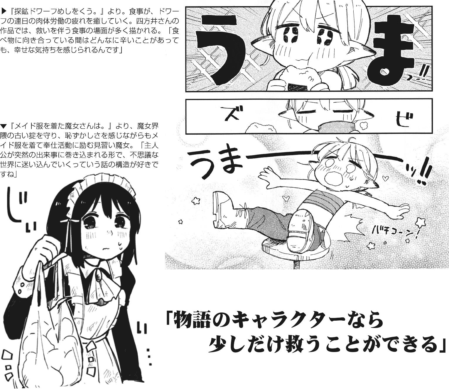一方で「娯楽として楽しんで読んでもらいたい」と、読者に寄り添う姿勢も忘れない。141で発表した『ラーの油を見に行く!!』は、ごく普通のラー油に隠された秘密を探るコメディ。「同時に発表した『まぶしい世界の暗がりに。』が全体的に暗めの雰囲気だったので、良いバランスが取れました」と話す通り、明るく楽しい作風を開拓した。また、最新作『探鉱ドワーフめしをくう。』では、「キャラクターをしっかり作る」ことを意識し、過酷な探鉱で働く金髪のドワーフを主人公に据えた異世界ものに挑戦。貧困からの脱却を夢見て休むことなく働きつつ、美味しいご飯から活力を得る姿を、ドワーフ目線からファンタジー風味に描いた。「最後に報われる瞬間を描きたかったので、主人公は厳しい境遇に置きました。けれど、それをあまり悩まない、辛さを気にしない性格にしました」と語るように、前向きな読後感が爽やかな作品だ。