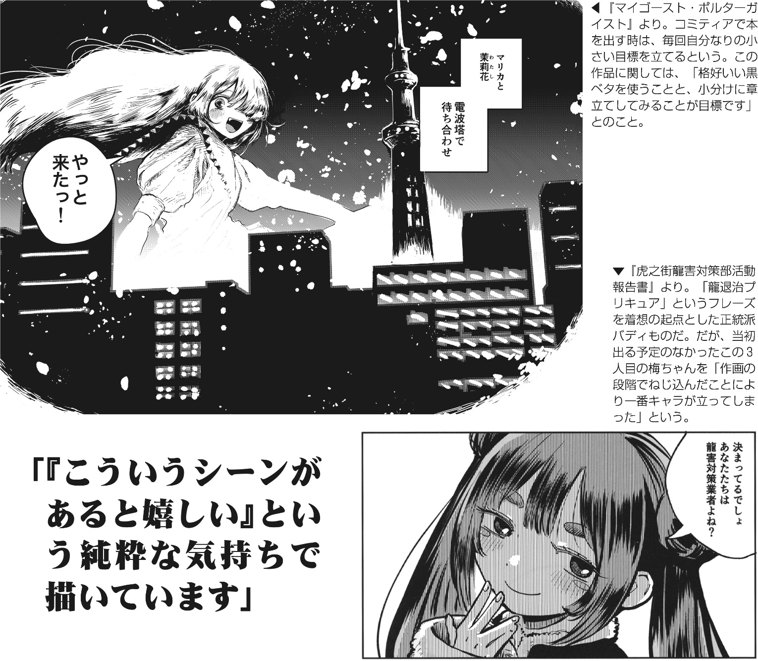 コミティアへ初参加したのは18年。当初はイラスト集を発表していたが、21年のエアコミティア135で発表した『タオルケットの友達がいる女の子のお話』がSNSで好評を得てからは、短編の漫画作品に軸足を移した。日々の生活の中で感じるストレスから解放される居場所を描いた『タオルケット~』を始めとした初期の作品を描くきっかけは「自分自身のストレス」だったと語る。「描いている自分が現実世界で辛い状態にあっても、物語のキャラクターなら少しだけ救うことができる。それが自分の救いにもなってたんじゃないか、と思います」