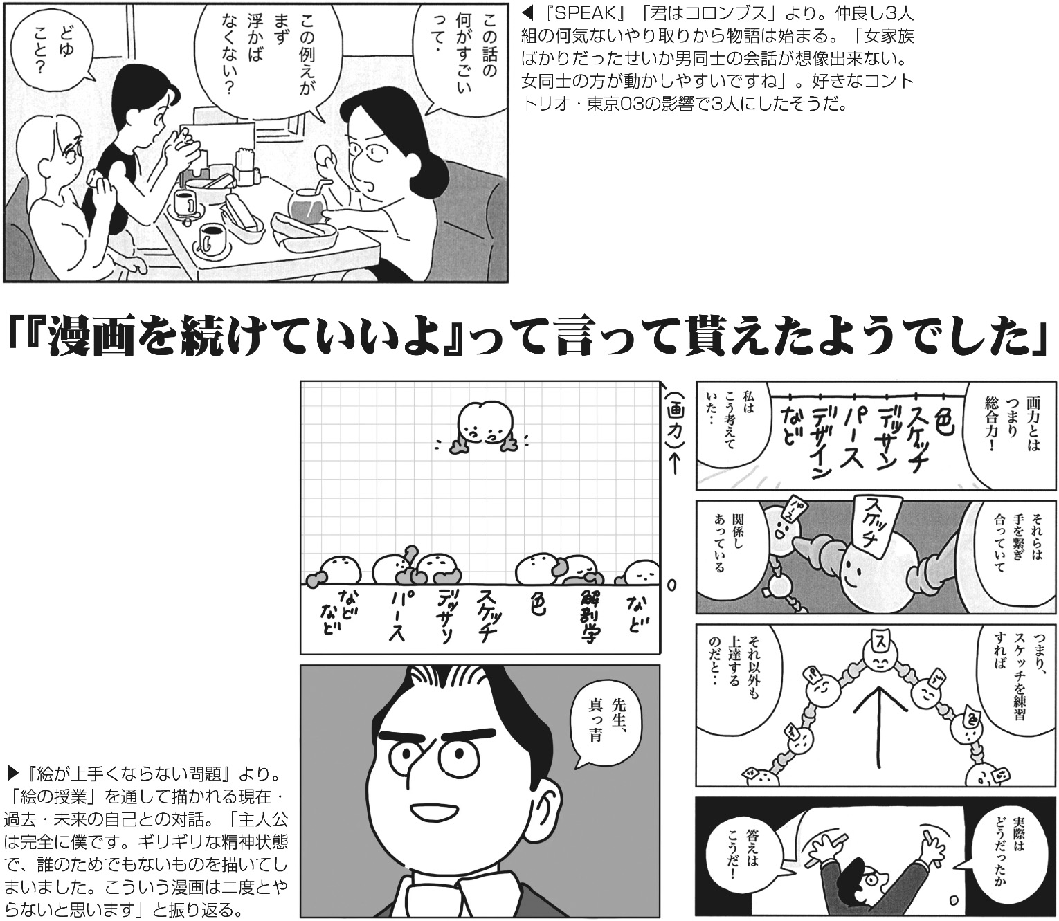 小さい頃から創作活動に親しんできた四方井さん。「小学5年くらいの時に、同級生全員を動物化して漫画を描いてたりしました」。中高生の時には一度は創作から距離を置くものの、Twitterで幼少期に親しんだ作家たちの作品を目にしたことで創作意欲が再熱。「オリジナルや二次創作のイラストとか、1ページの漫画をピクシブに上げていました」。その中で15年に投稿した作品が編集者の目に止まる。「漫画を作るにあたり、それまであまり考えなかった『他者に読まれること』を重視するようになりました」と、作家としての在り方に大きな影響を受けた。