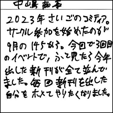 ストレスが少ない中でゆっくり会場を回る一般参加者が多かったのか、サークル参加者からは「思った以上にたくさんの人に見て貰えた/買って貰えた」という話が多くありました。ただ「売れ行きが振るわなかった」という声も少なからずありましたので、見られ方/売れ方が違ったという認識が正しそうです。顕著な例としては海外からの参加者が増えたことです。海外参加者の案内強化はコロナ禍前まで大きな課題の一つでしたので、こうしたところでも元に戻っている手応えを感じます。スムーズな案内が出来るよう対応を改めて考えていきたいと思います。