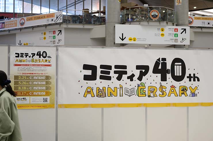 今回の1Fアトリウムの出口付近でも大きなポスターを掲示してアピールしましたが、来年2024年はコミティア40周年を迎えます。1年を通してさまざまな企画などで盛り上げていく予定ですので、よろしくお付き合いください!
