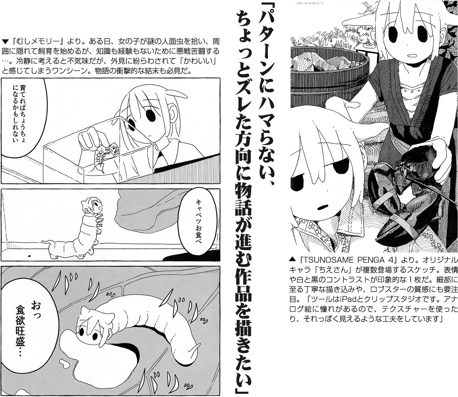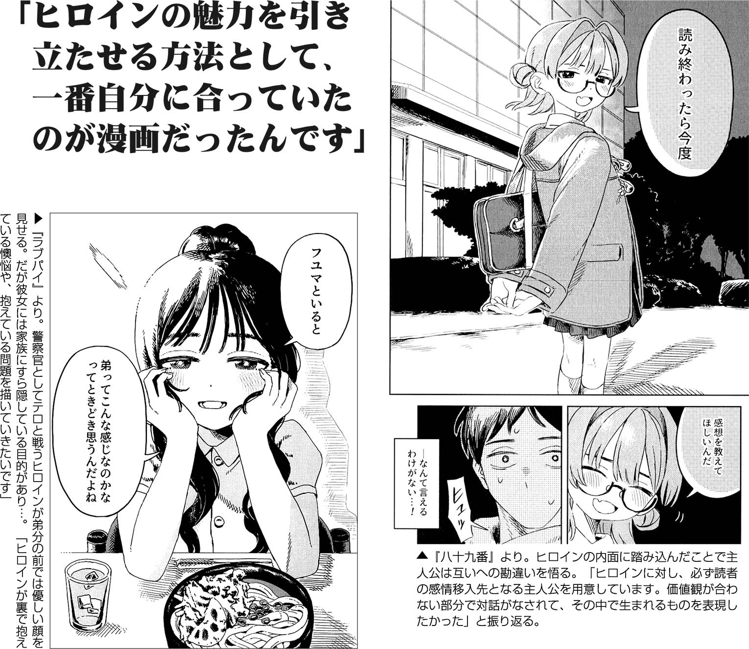 作風も様々だが、その根底にあるのはキャラクターへの愛だと言う。「ヒロインの魅力を引き立たせる方法として、一番自分に合っていたのが漫画だったんです」。そうして描かれるヒロインたちは皆、主人公にとっても読者にとっても一筋縄ではいかない存在だ。例えば23年発表の『八十九番』では、創作者志望で美術に深い関心を持つ少女を軸に、彼女に恋してしまった少年の妄動と失敗を描く。「思想や目標を持っていて、その芯を通す生き方をしている少女が好き。そういう少女たちの大人びた価値観に左右される主人公を描いているうちに、いつのまにか物語や教訓が生まれる」と言う通りの作品に仕上がった。
