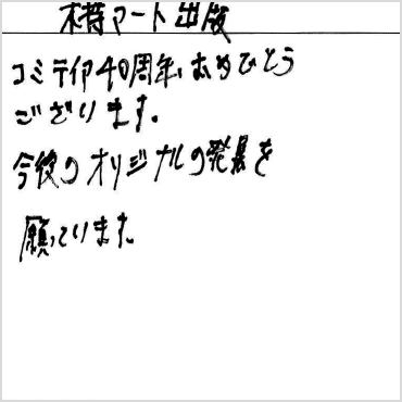 ともあれ、参加者の皆さんの協力のおかげで大きなトラブルもなく、コミティア40周年の最初の回は盛況の内に幕を閉じました。引き続き40周年を盛り上げていきますので、次回もよろしくお付き合いください!