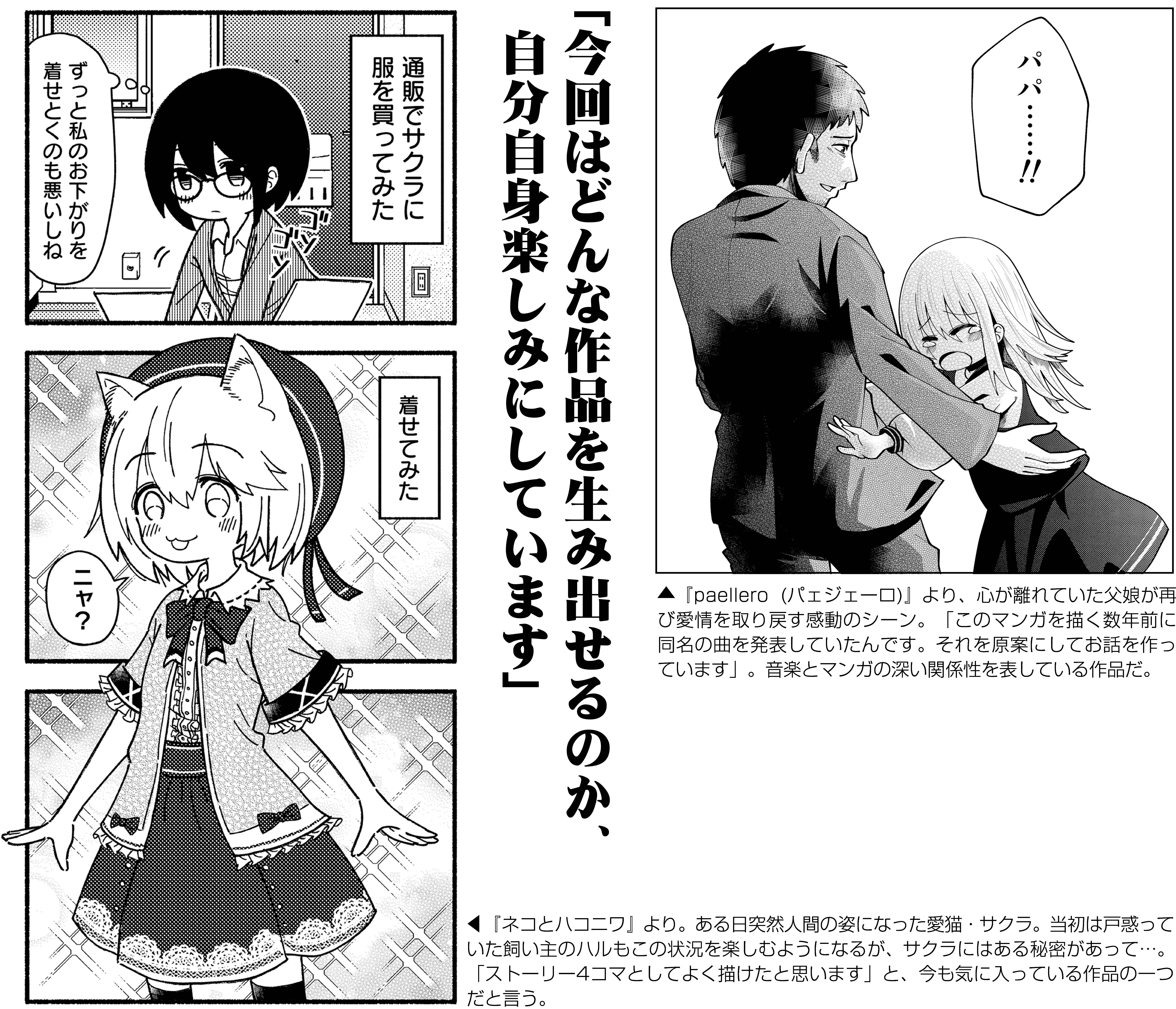 「マンガか音楽、どちらかを中心にやっているっていう意識は無くて、その時々作りたいものを作っている、というイメージです」。その言葉通り、コミティアでは『ネコとハコニワ』『畦道で会えたら』といったマンガ作品を相次いで発表する傍ら、パソコンでの作曲についてマンガ形式で紹介するコラム『漫画家ちゃんが作曲をするようです』をティアズマガジン143〜146で連載。「マンガでは、多くの人に面白いと思ってもらえるような正統派のストーリーを意識していますし、作曲でもシンプルなコード進行で気持ちよく最後まで聴ける曲を目指しています」と語るように、創作という点では相通ずる所も多いようだ。