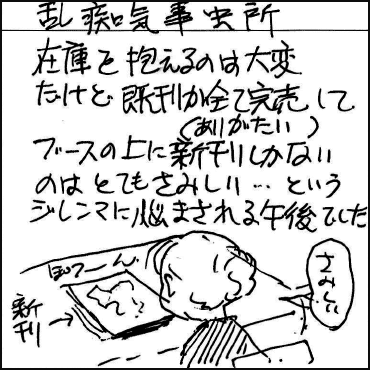 参加サークル数は5065サークルで、4年半ぶりに5000の大台になったこともあり、会場内は終日大賑わい。ここまでの盛り上がりも久しぶりでした。12時半にはカタログが完売するほどで、時間によっては歩きにくいほど。サークルの落選を避けるため、急きょ借りた東8ホールに移動することになった出張マンガ編集部は、サークルスペースから離れた場所での実施となりましたが、こちらも終日賑わっていました。