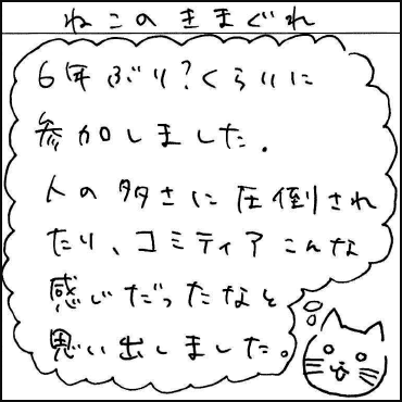 この人出の多さはGW開催でなかったことも影響があるのかもしれません。もともと今回5月下旬開催となったのは、3月末に東京ビッグサイト周辺で開催された「フォーミュラE」の影響でした。開催前後の1ヶ月ほど東京ビッグサイトが使用不可となり、玉突き式にコミティア含めた各催事の日程がズレることになりました。連休から外れたことでサークル参加者が大幅に減ることも覚悟していましたが、むしろ増えたような手応えがあります。