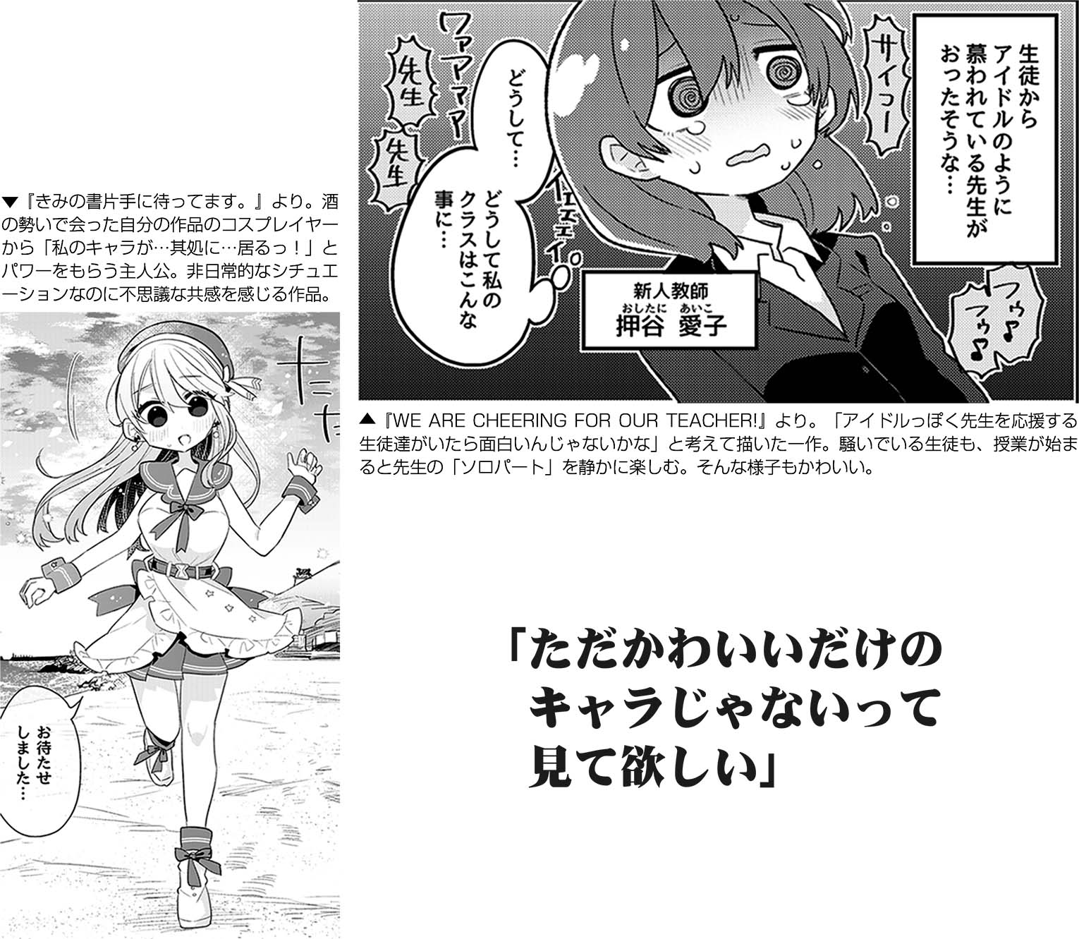 ところがこの連載が終了したところで行き詰まってしまいます。次の連載に向けて準備を進めたいのに、半年くらいアイデアを出せず悩む日々。そんな中、ふと思い付きでSNSに載せたマンガが転機となります。生徒と上手く話が出来ない新人の先生が、なぜか生徒にアイドルのように応援される…。これが『コミック電撃だいおうじ』に連載されたドタバタコメディ「推させて! Myティーチャー」に結び付き、コミティアで番外編を出すほど思い入れのある作品となりました。「非日常的なシチュエーションに翻弄される主人公を描く」という作風は、現在『WEBコミックガンマぷらす』で連載中のコミカライズ「猫耳少女は森でスローライフを送りたい」(原作:yocco)でも活かされています。