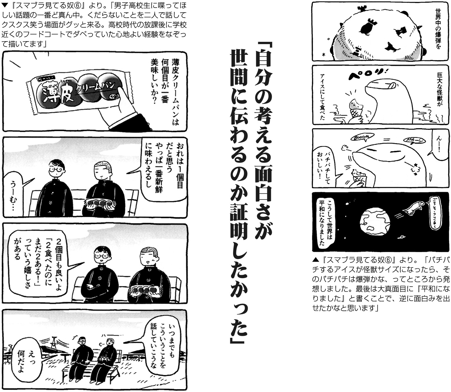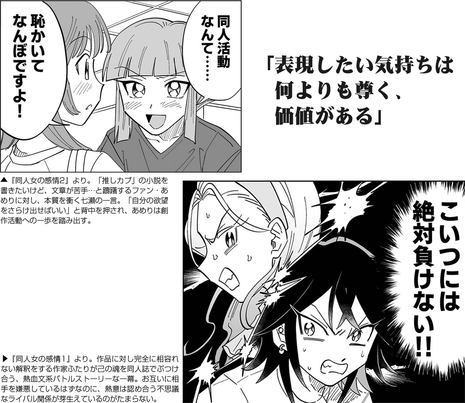 現在は連載で多忙な日々が続く一方、「商業では溜め込んだネタを練っていくんですが、同人の場合は描けそうなネタを思いついたらすぐに描き始めています」と、肩の力を抜いた発表の場として同人誌を制作しています。昨年発表された『死後同人誌のゆくえどうする!?』は、まさにご自身のマンガ読みとしての発想が活かされた作品。若くして亡くなり幽霊となった女の子が、生前買った同人誌を親から隠し通そうと奮闘するギャグマンガですが、遺された親の言葉にしんみりする主人公のシリアスな姿も印象に残ります。