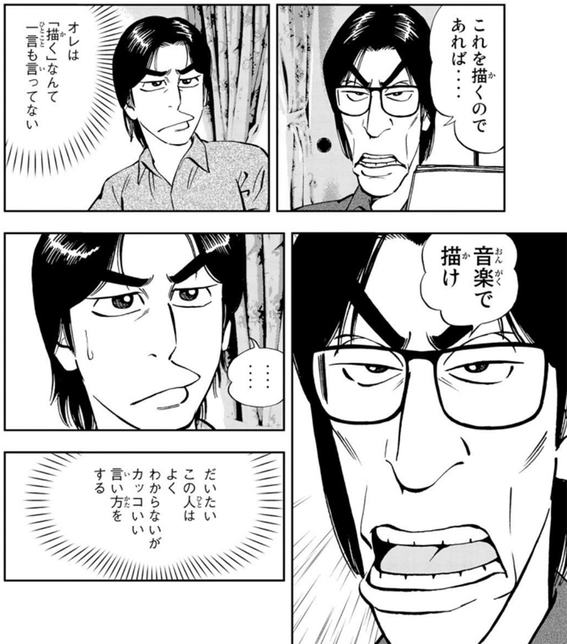 ──栗原さんの言葉にはそう感じてしまうような迫力と重みがあるような気がします。作中で特に印象的なのは、小林さんに言った「音楽で描け」ってセリフです。