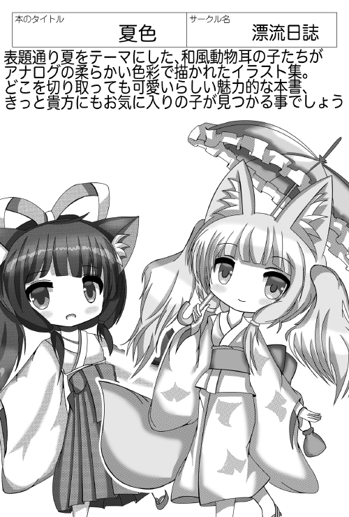 ●猫とネコミミ少女のイラスト集。ふわふわな髪とボリューミーなスカートが可憐で柔らかく、見ていてほんわか和む。溶け込むような主線と、色とりどりながらも優しい濃淡のある水彩タッチが為せるワザか。毛並みが丹念に描かれた猫も愛らしく、丁寧に仕上げられた作品だ。(埼玉県・あまいも)