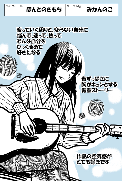 ◆やわらかい線と見やすいコマ割りがとてもよかった。頒布する本はもっと良い装幀とのことで次見かけた際には1冊買おうと思います!(東京都・もちと)