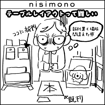 最近の傾向としてSNSでの宣伝が一般的になり、目的のサークル以外に足を運ばない方が増える傾向があります。こうしたWEBカタログにせよ、見本誌コーナーのレイアウト調整にせよ、「思いがけない出会い」を活性化しようという目論見があります。