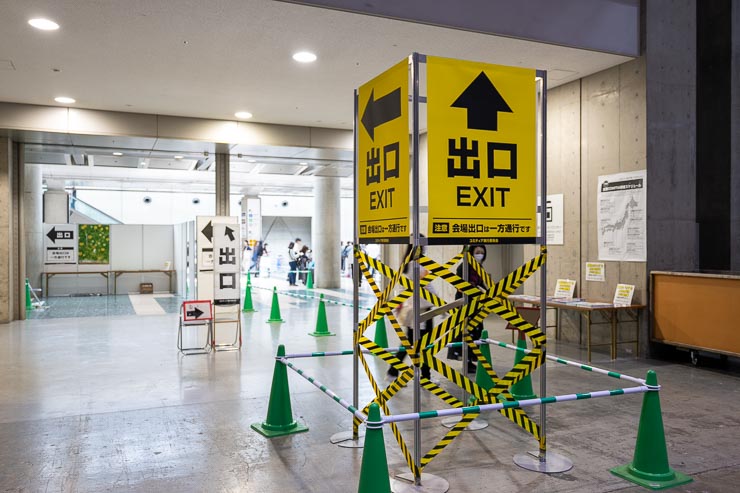 来場者の増加に対応するため、会場内のサインや案内の強化もしています。なかでも、出口付近に設置した大きな「出口」サインは、多くの参加者の目に留まったかと思います。特に、入場口から出ようとする方も多いため、遠くからでも明確に分かるよう工夫しています。それ以外にも海外からの参加者の増加も意識しつつ、ゴミ箱のサインを目立たせたり、会場内での撮影ルールの張り紙を増やしたり、新しい試みを行っています。