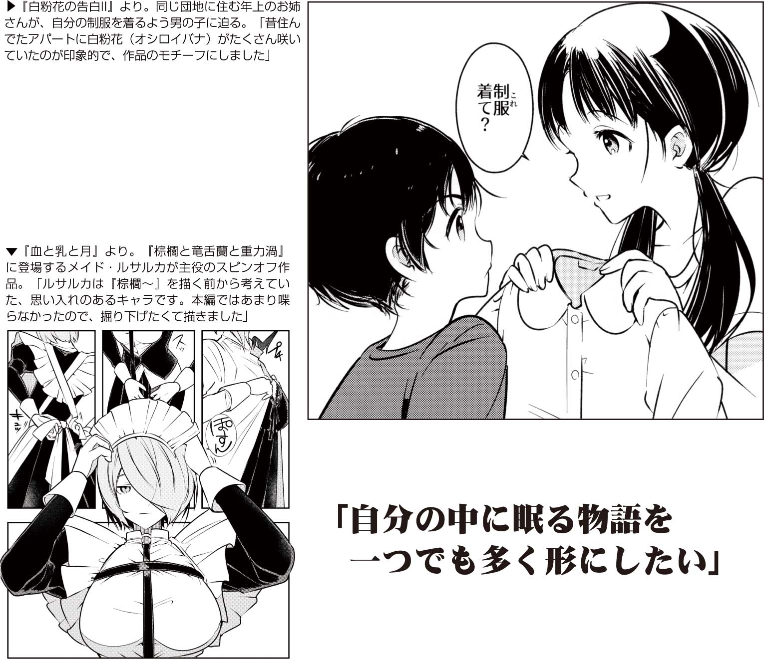 その後も思春期の子供たちの少し背徳的な人間模様を描いた『白粉花の告白』や、現実と幻の区別が曖昧になる館に迷い込んだ女性の一日を描く『ランダルギィ・ポー幻想館』といった作品を次々発表。「常連の読者さんが増えていって、交流することが新刊を出す原動力になります」。さらに商業でも複数の雑誌で読切を掲載。「今は、自分の中に眠る物語を一つでも多く形にしたい」と、コロナ禍のブランクを埋めるように活動している。