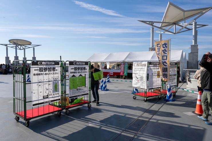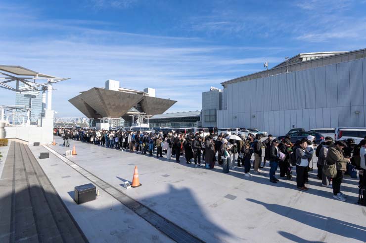 一般参加者の入場待機列は西4ホール横にある広場・屋上展示場を利用しましたが、こちらは西3ホールの開催されていた別の催事でも使用しており、使える面積は半分ほど。さらに、そこから西4ホール、南1・2ホール、南3・4ホールのそれぞれに振り分ける案内も必要でした。南1・2ホールは出入り口の導線が狭く、開場の11時前後には案内が混乱してしまった場面もありました。