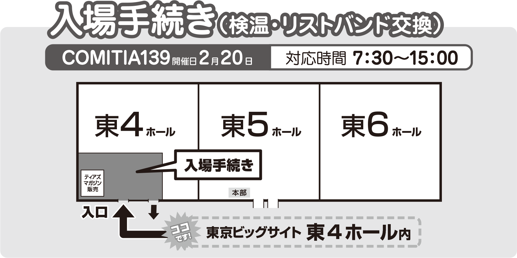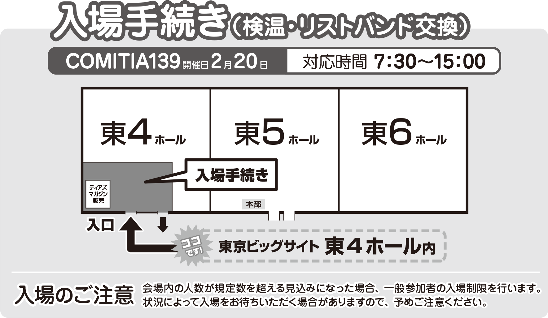 リストバンドによる入場者確認を行います。来場したら「入場手続き」にて検温した後、「サークル通行証」を入場用のリストバンドと交換し、そのリストバンドを着用した上で入場してください(再入場も同様です)。 詳しくは下記「入場の手順(サークル参加者用)」をご覧ください。