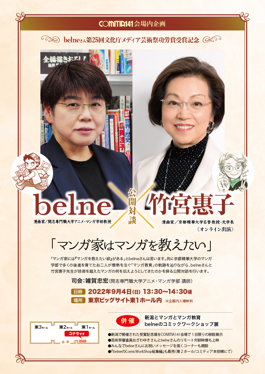 長年、実地版&カタログ誌上の「コミックワークショップ」でお世話になっている漫画家・belneさんの第25回文化庁メディア芸術祭功労賞受賞 を記念して、会場内企画を行いました。
